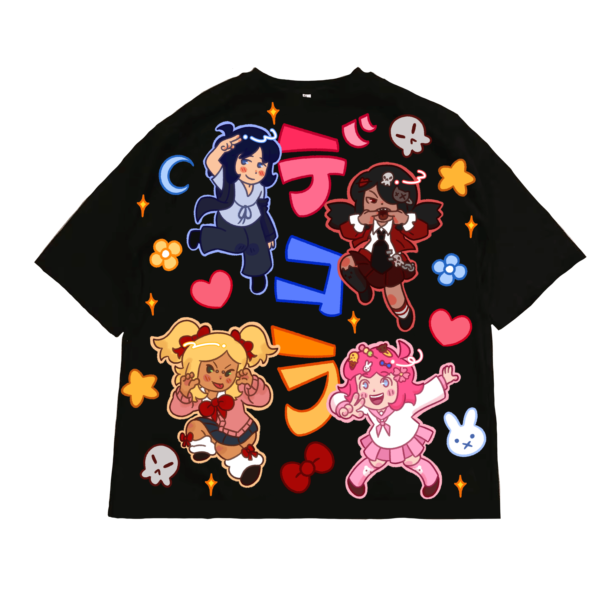 My debut shirt, featuring all 4 girls; Aika, Amaya, Mira, and Sailor! The Japanese lettering spells 'DECORA', and is the core idea of this brand.